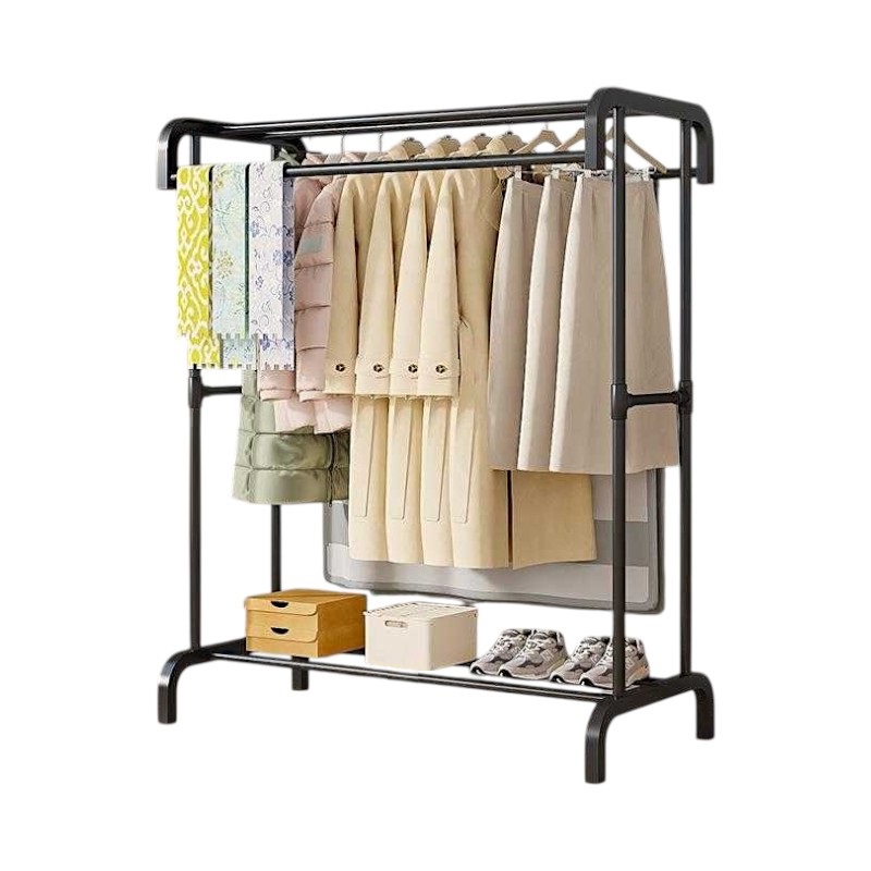 Κρεμάστρα δαπέδου με μεταλλικό σκελετό και μεγάλο ράφι παπουτσιών, ιδανική ως έπιπλο εισόδου ή για την οργάνωση των ρούχων στο δωμάτιό σας.