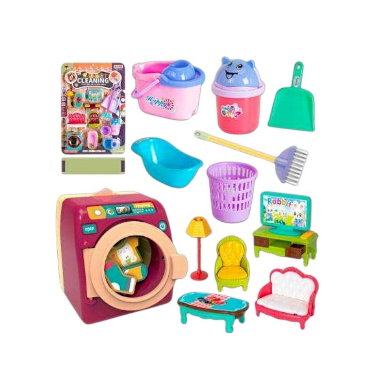 Παιδικό μίνι σετ καθαριότητας σπιτιού ιδανικό για την κούκλα ή το κουκλόσπιτό σου, με πλυντήριο και όλα τα σύνεργα και αξεσουάρ που θα χρειαστείς για ένα λαμπερό σπίτι!
