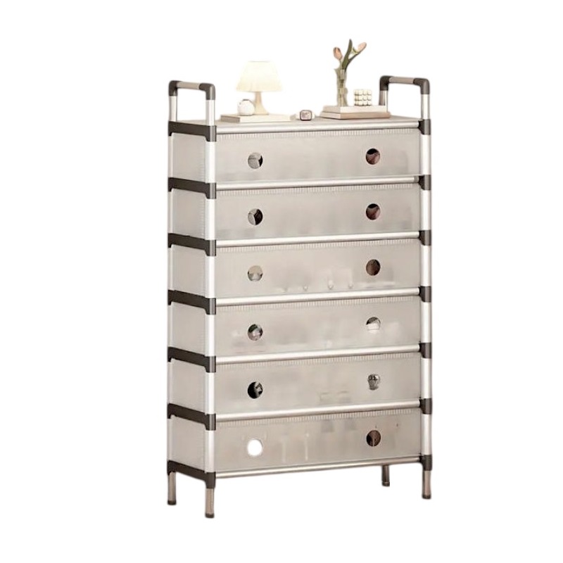 Παπουτσοθήκη δαπέδου με ράφι, με μεταλλικό σκελετό και 6 συρταρωτές θήκες με λεπτή, πλαστική, εύκαμπτη πρόσοψη,