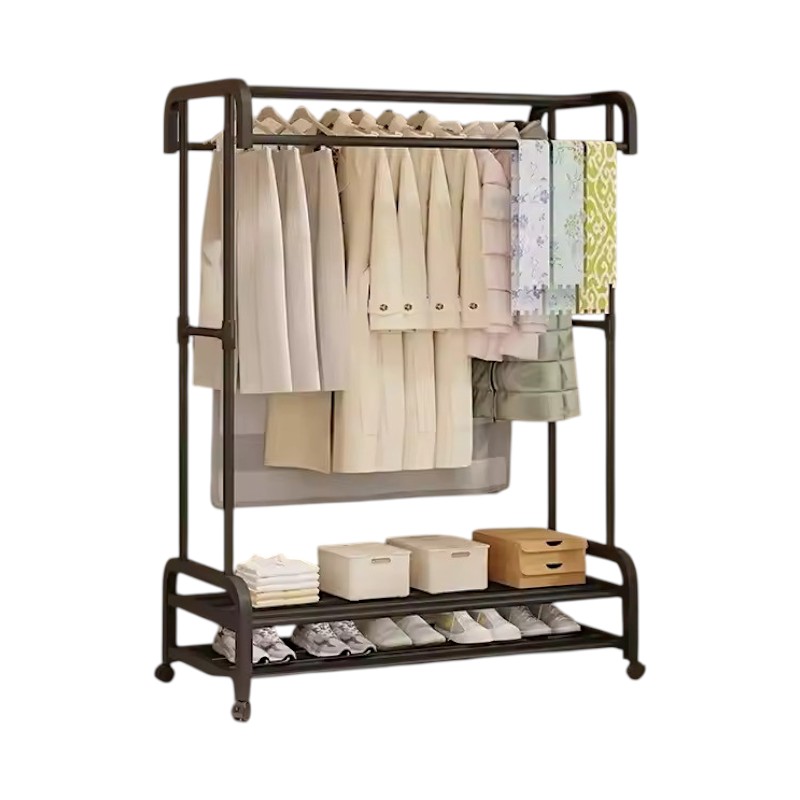Τροχήλατη κρεμάστρα δαπέδου μεταλλική, με 2 ράφια παπουτσιών, ιδανική ως έπιπλο εισόδου ή για την οργάνωση των ρούχων στο δωμάτιό σας.