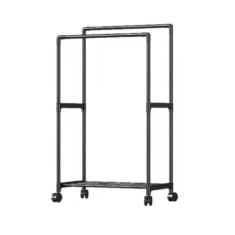 Τροχήλατη κρεμάστρα δαπέδου διπλή με ράφι παπουτσιών, ιδανική ως έπιπλο εισόδου ή για την οργάνωση των ρούχων στο δωμάτιό σας . Διαστάσεις: 115 x 57.5 x 30 cm.