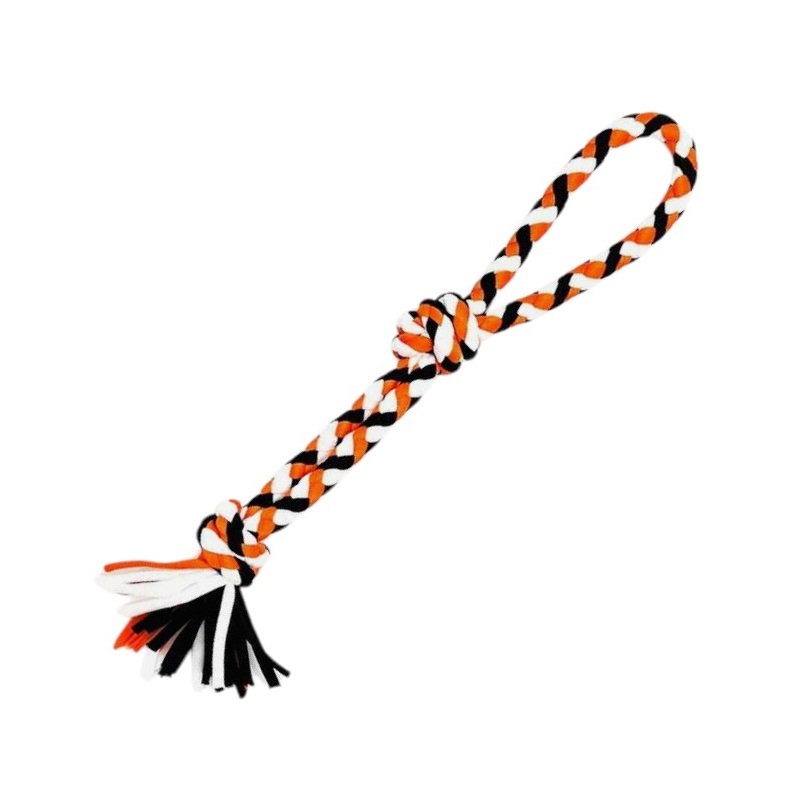 Παιχνίδι σκύλου σχοινί με κόμπους, από ελαστικό, ανθεκτικό, μη τοξικό πολυεστέρα, ιδανικό για παιχνίδια τραβήγματος/αντίστασης ενώ παράλληλα βοηθά στην υγιεινή στόματος του σκύλου σας καθώς καθαρίζει ήπια και απασχολεί τα δόντια του. Συνολικό μήκος: 35cm.