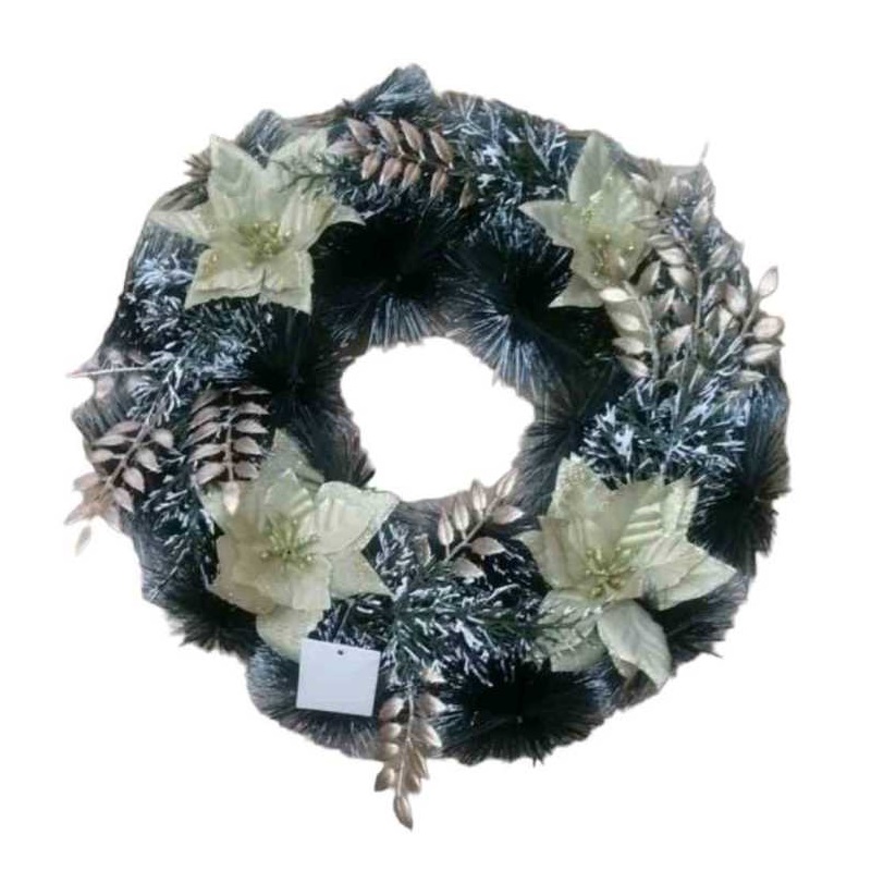 Χριστουγεννιάτικο διακοσμητικό στεφάνι διαμέτρου 40cm, με κλαδιά ελάτου και πλούσια διακόσμηση με άνθη και στολίδια.